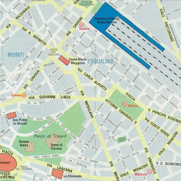 Stazione Termini, Santa Maria Maggiore, Via Nazionale, Via Cavour, San Pietro in Vincoli, Piazza Vittorio, Colosseo, San Clemente, Domus Aurea
